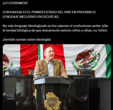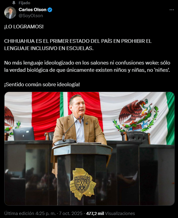El 7 de octubre, con 17 votos a favor y 14 en contra, se reformó el artículo 8° de la Ley Estatal de Educación en Chihuahua, para prohibir el lenguaje inclusivo en las aulas de nivel básico. El dictamen fue propuesto por el diputado Carlos Olson San Vicente, quién afirmó para Omnia Noticias que “utilizar un lenguaje inclusivo es distorsionar el aprendizaje y la correcta comunicación entre los seres humanos”, pero, ¿qué tan cierto es esto?